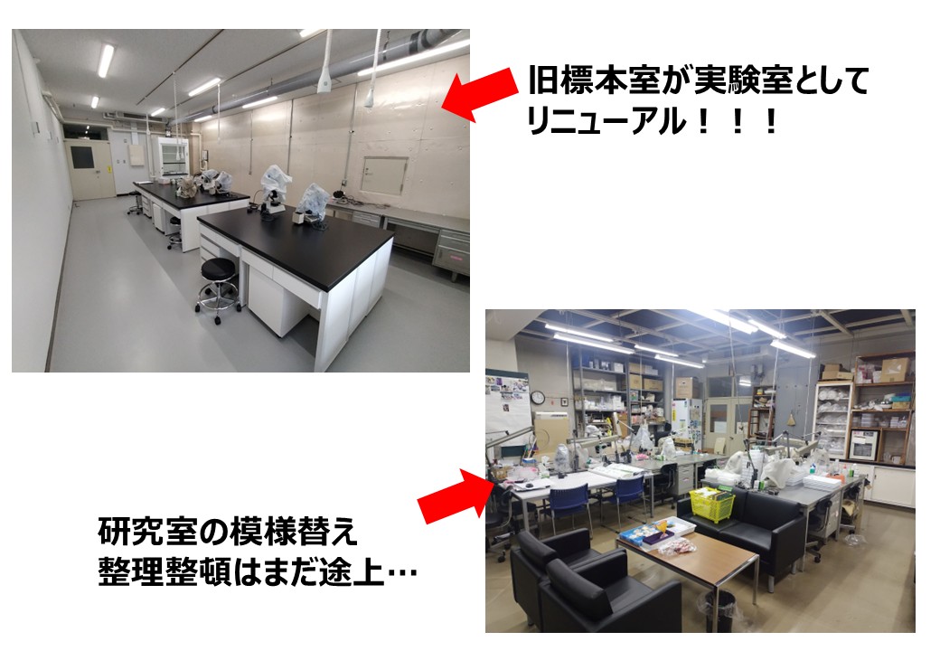①旧標本室が実験室としてリニューアルしました(画像)。ありがたいことに、ドラフトを設置していただけたので、これまで停滞気味であった組織学研究をどんどん進め、比較発生学研究にまい進していく所存でございます。